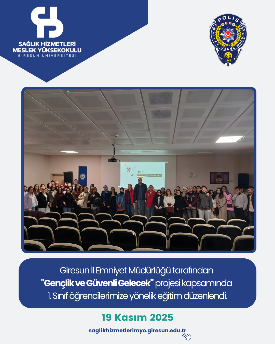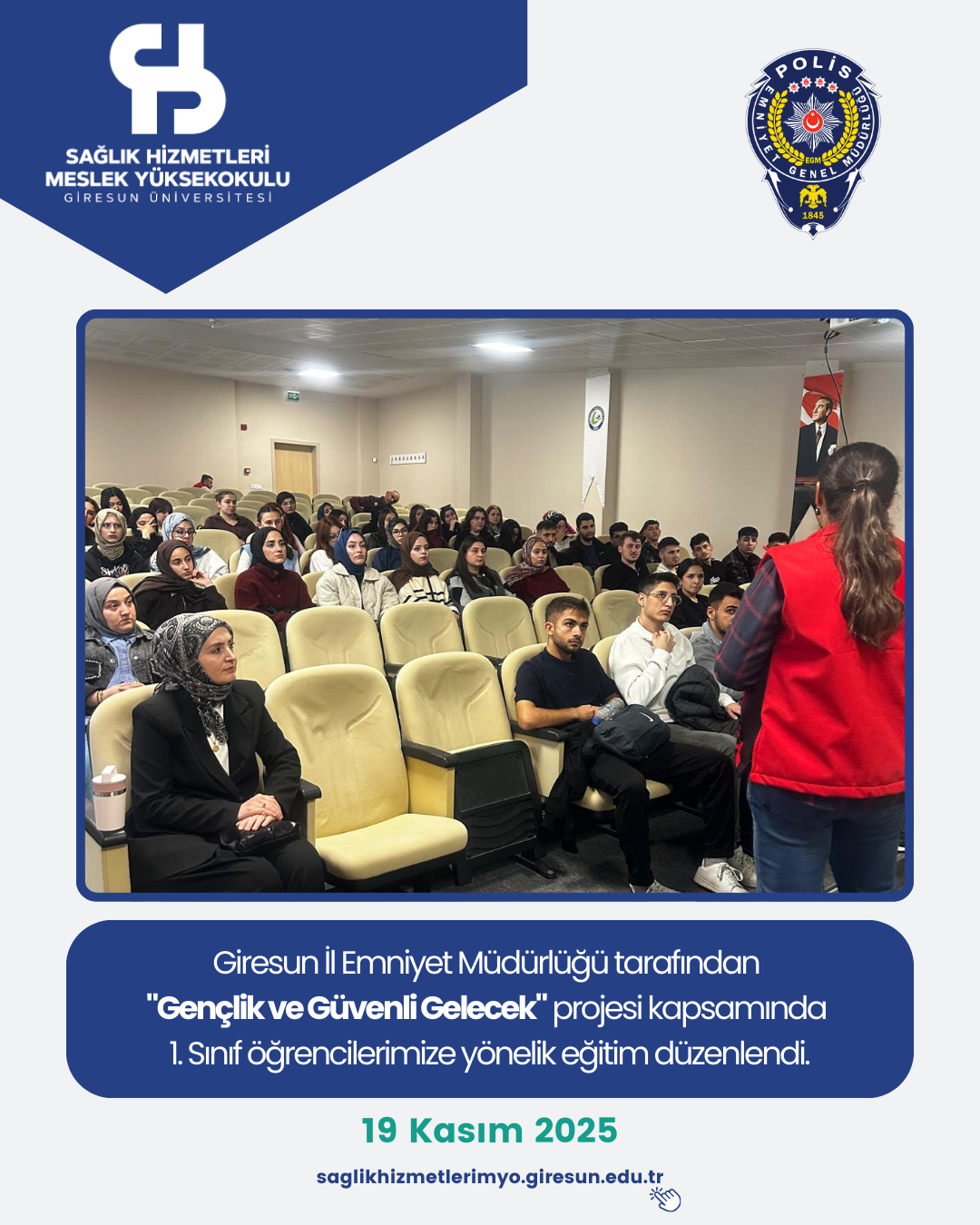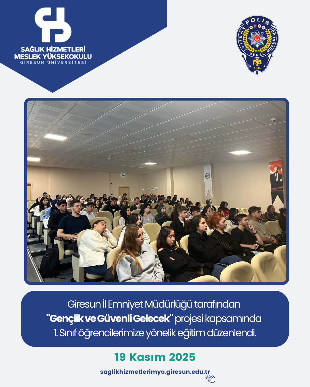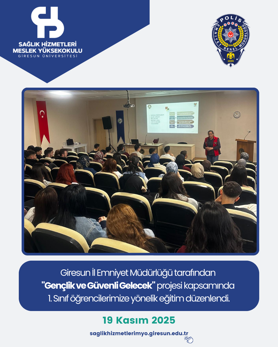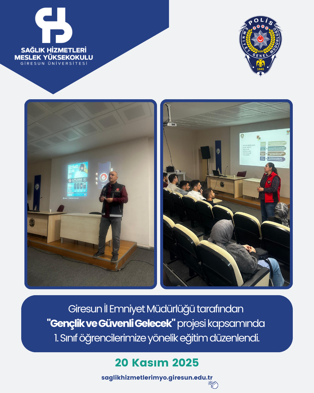Giresun İl Emniyet Müdürlüğü Terörle Mücadele Şube Müdürlüğü tarafından yürütülen "Gençlik ve Güvenli Gelecek" projesi kapsamında, Giresun Üniversitesi Sağlık Hizmetleri Meslek Yüksekokulu öğrencilerine yönelik bilgilendirme eğitimi düzenlendi.