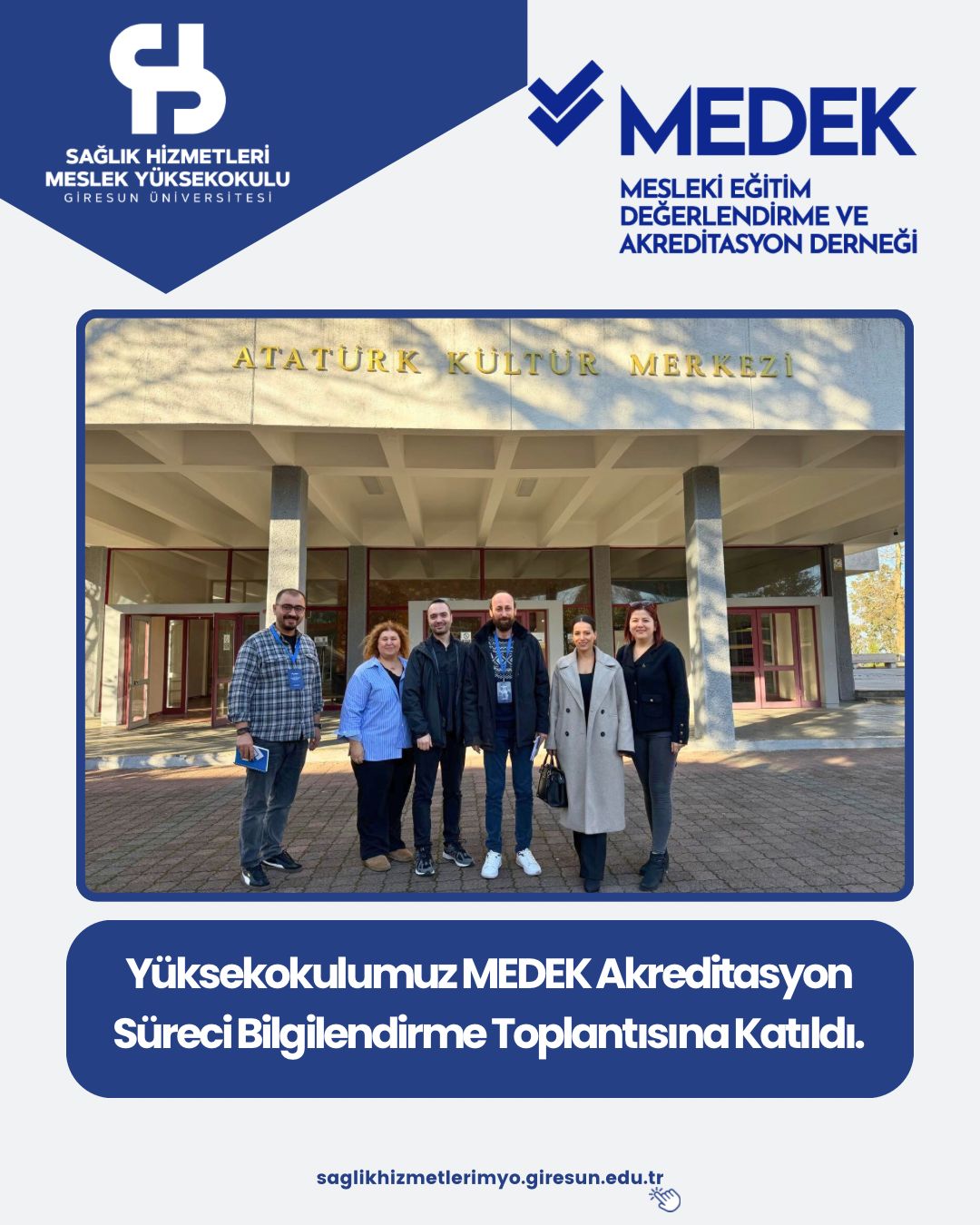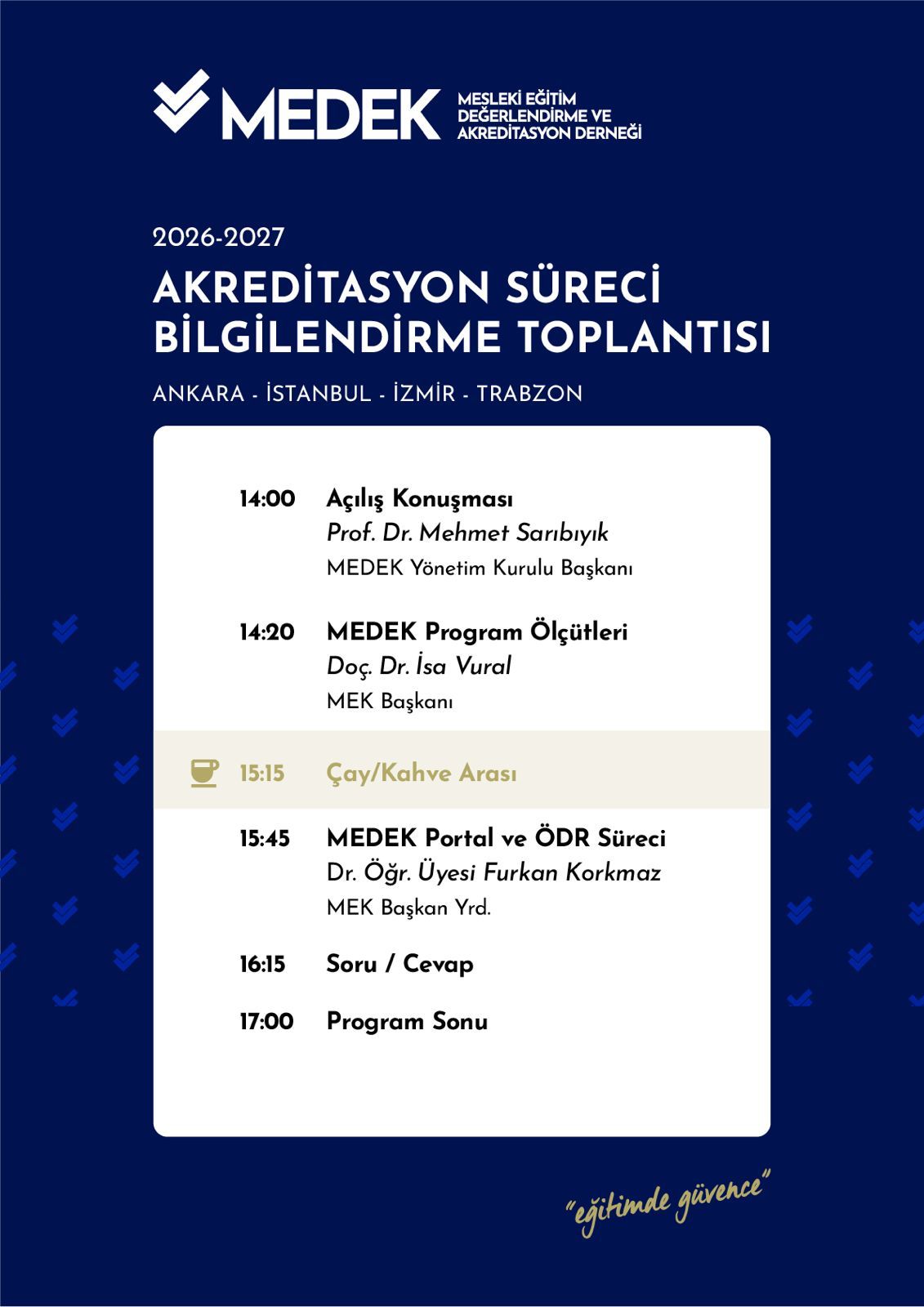 Mesleki Eğitim Değerlendirme ve Akreditasyon Derneği (MEDEK) tarafından düzenlenen 2026–2027 Akreditasyon Süreci Bilgilendirme Toplantısı, 15 Şubat 2026 tarihinde Trabzon’da, Karadeniz Teknik Üniversitesi Atatürk Kültür Merkezi Mustafa Reşit Tarakçıoğlu Salonu’nda gerçekleştirilmiştir.