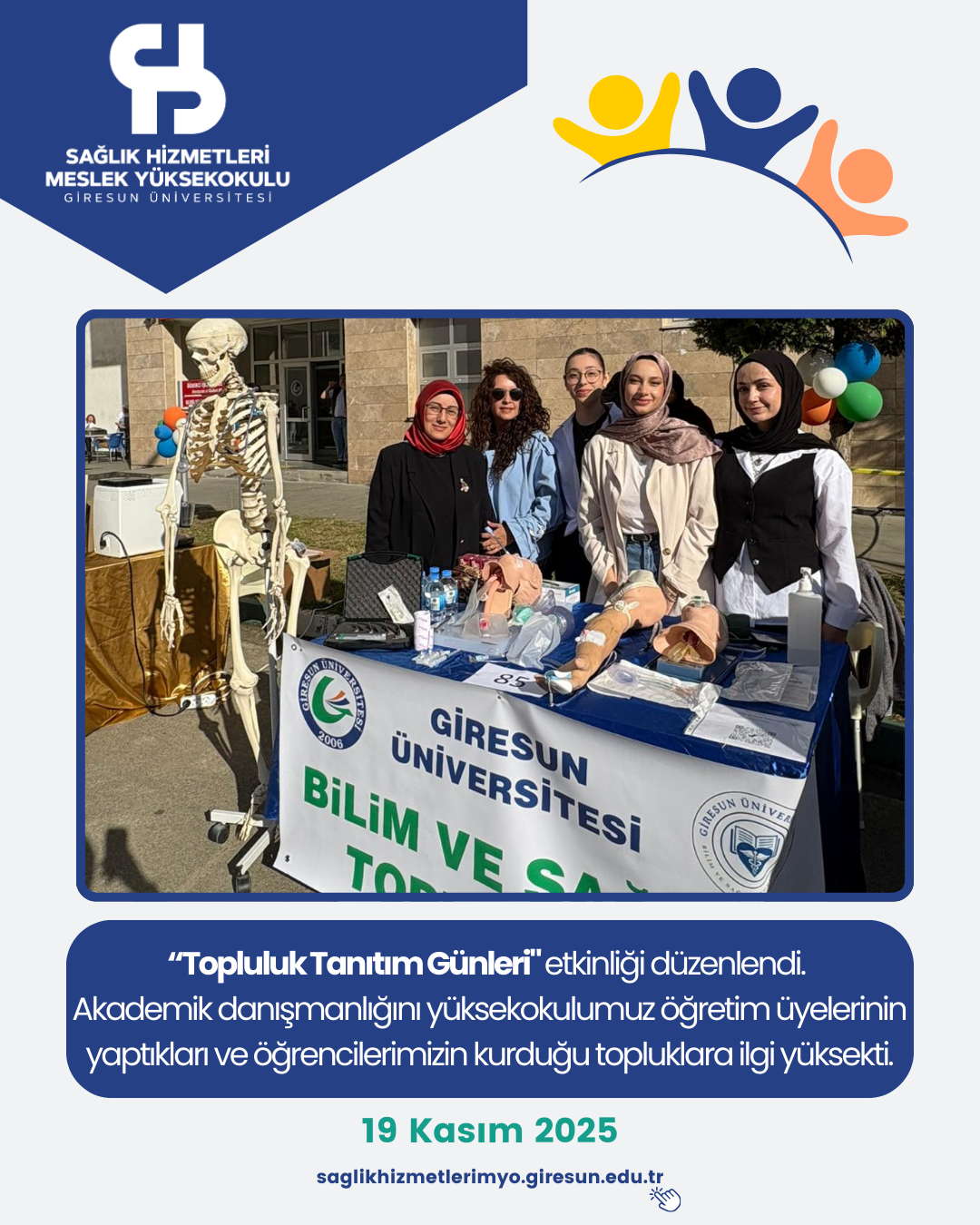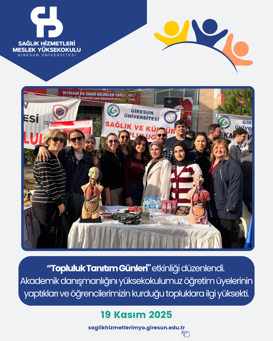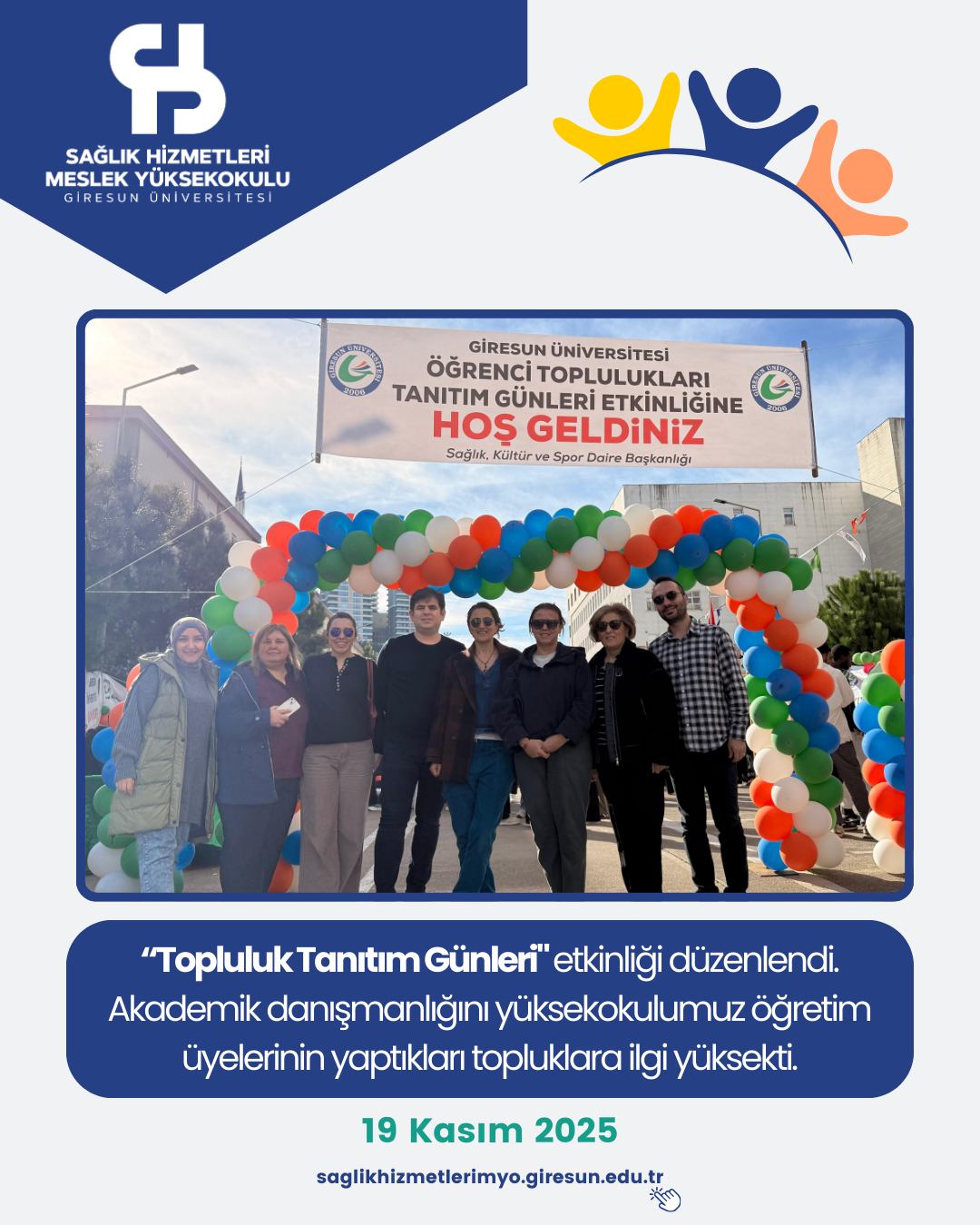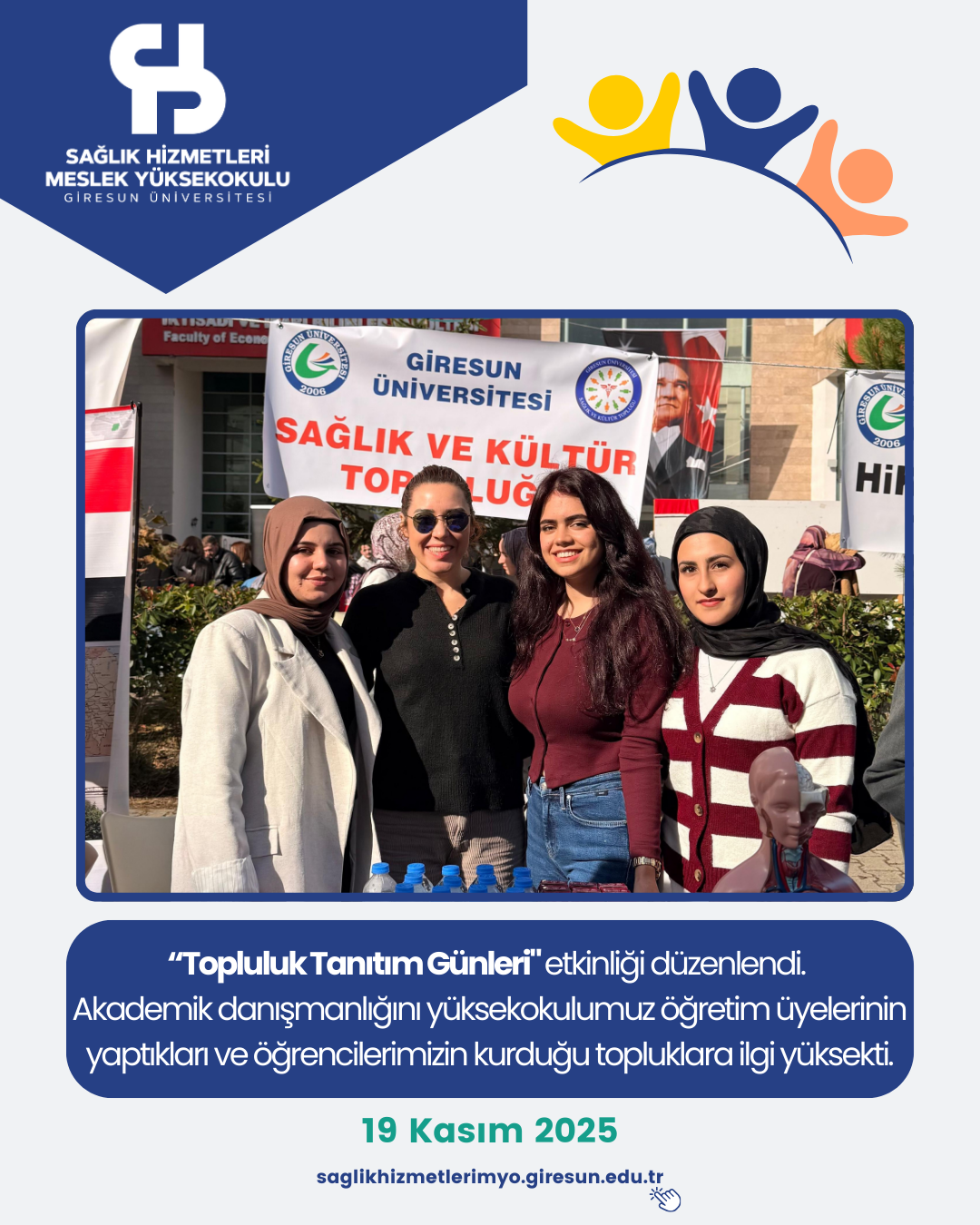 Sağlık Hizmetleri Meslek Yüksekokulu Müdürlüğü, topluluk faaliyetlerinin öğrencilerimizin mesleki, sosyal ve kültürel gelişimlerine önemli katkı sunduğunu vurgulayarak, Topluluk Tanıtım Günleri etkinliğinde görev alan tüm akademik danışmanlara ve öğrencilerimize teşekkür etti.