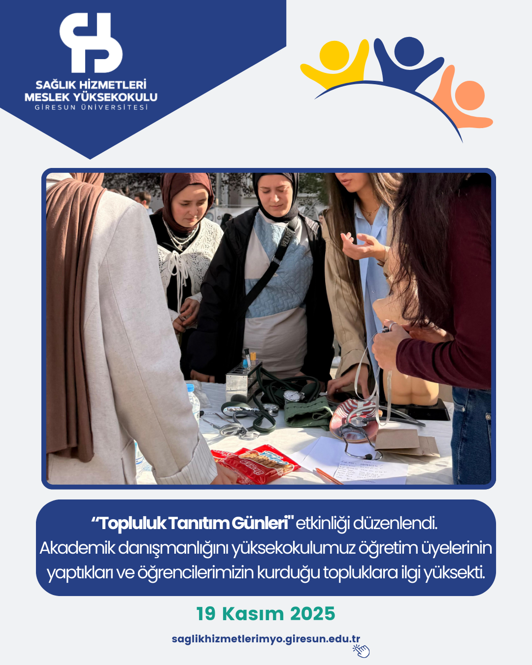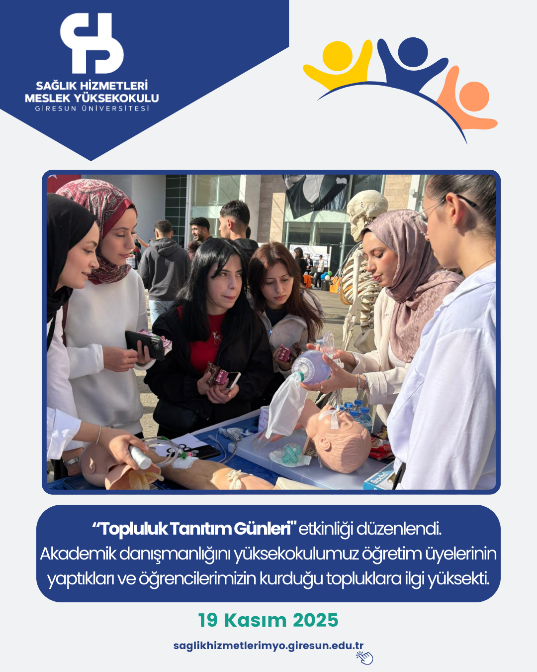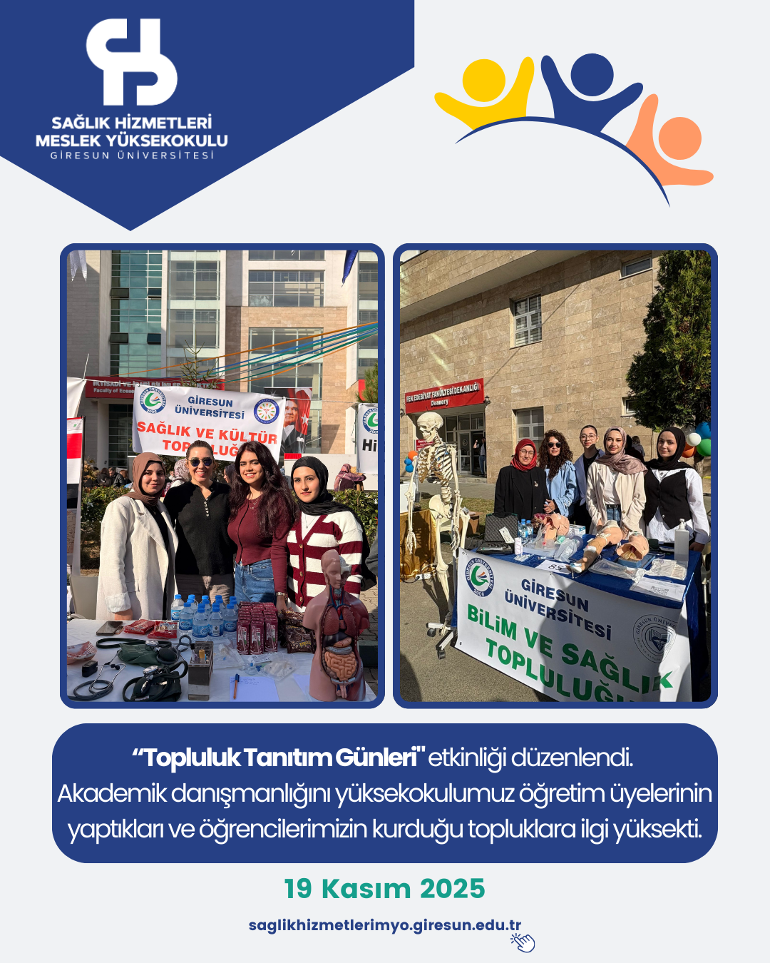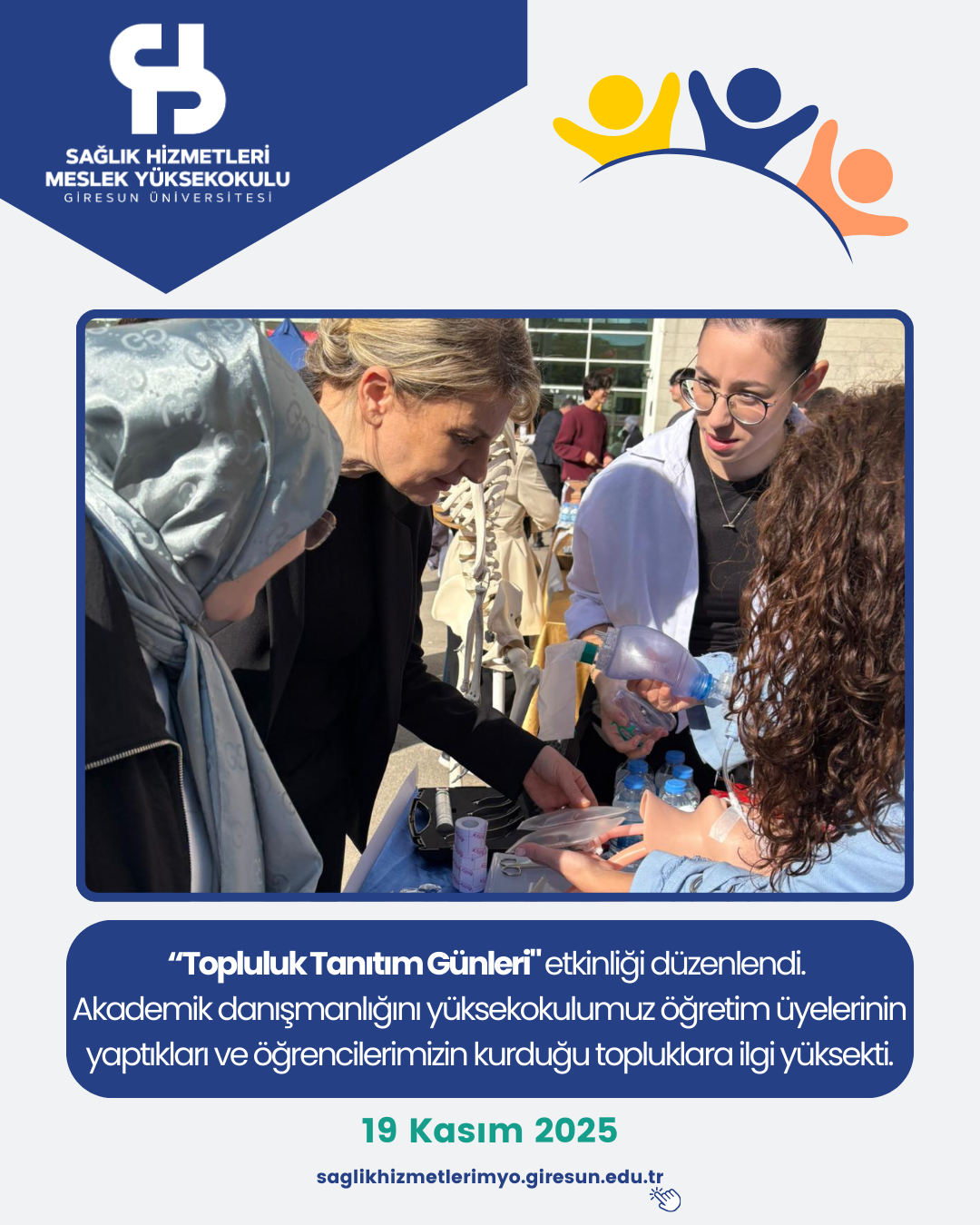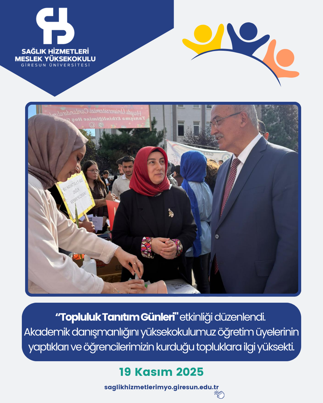Sağlık Hizmetleri Meslek Yüksekokulu Müdürlüğü, topluluk faaliyetlerinin öğrencilerimizin mesleki, sosyal ve kültürel gelişimlerine önemli katkı sunduğunu vurgulayarak, Topluluk Tanıtım Günleri etkinliğinde görev alan tüm akademik danışmanlara ve öğrencilerimize teşekkür etti.