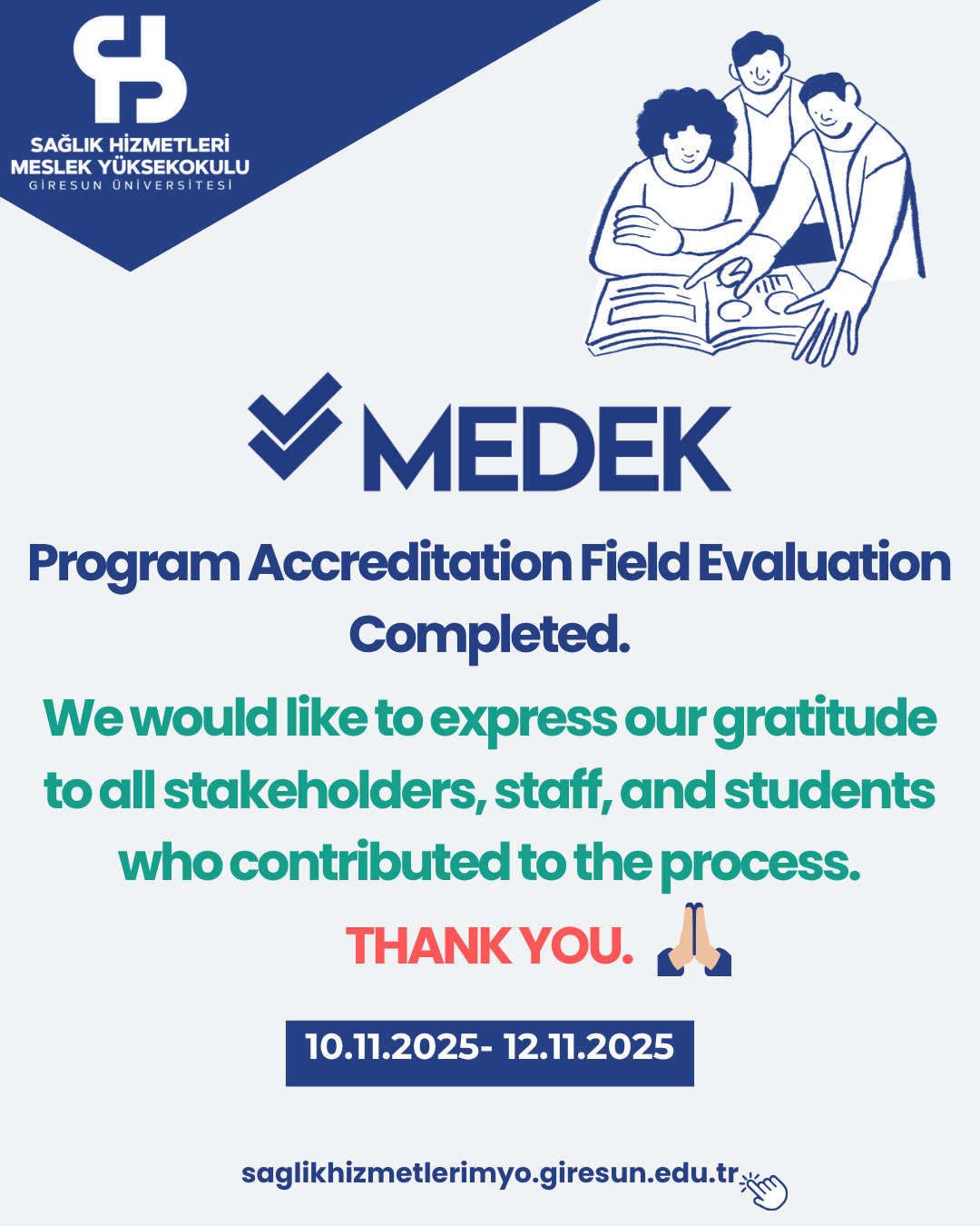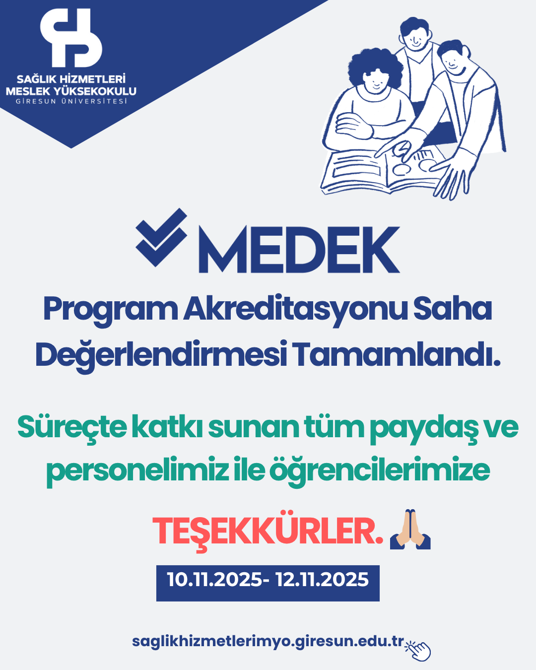 10–12 Kasım 2025 tarihleri arasında Mesleki Eğitim Değerlendirme ve Akreditasyon Derneği (MEDEK) değerlendirme ekibi, Giresun Üniversitesi Sağlık Hizmetleri Meslek Yüksekokulu’nda saha ziyaretinde bulundu. Ziyaret süreci boyunca değerlendirme takımı; eğitim-öğretim faaliyetleri, fiziki altyapı ve kalite güvence süreçlerini yerinde inceledi.