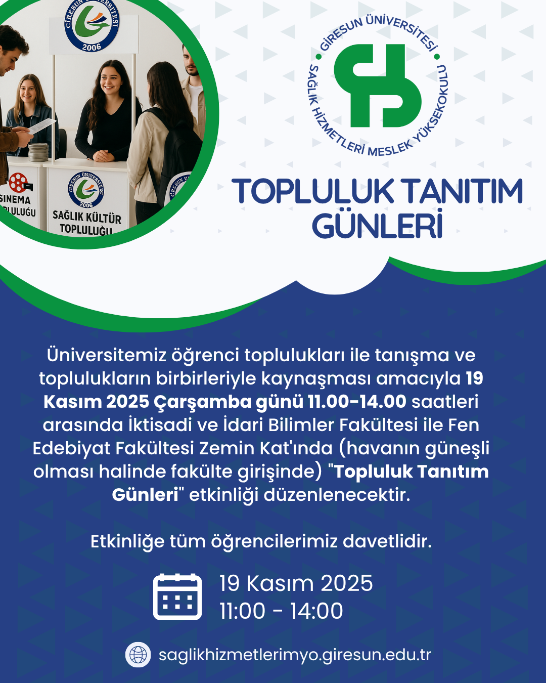 Üniversitemiz öğrenci toplulukları ile tanışma ve toplulukların birbirleriyle kaynaşmasını sağlamak amacıyla 19 Kasım 2025 Çarşamba günü 11.00–14.00 saatleri arasında İktisadi ve İdari Bilimler Fakültesi ile Fen Edebiyat Fakültesi Zemin Katı’nda (havanın güneşli olması halinde fakülte girişinde) “Topluluk Tanıtım Günleri” etkinliği düzenlenecektir.